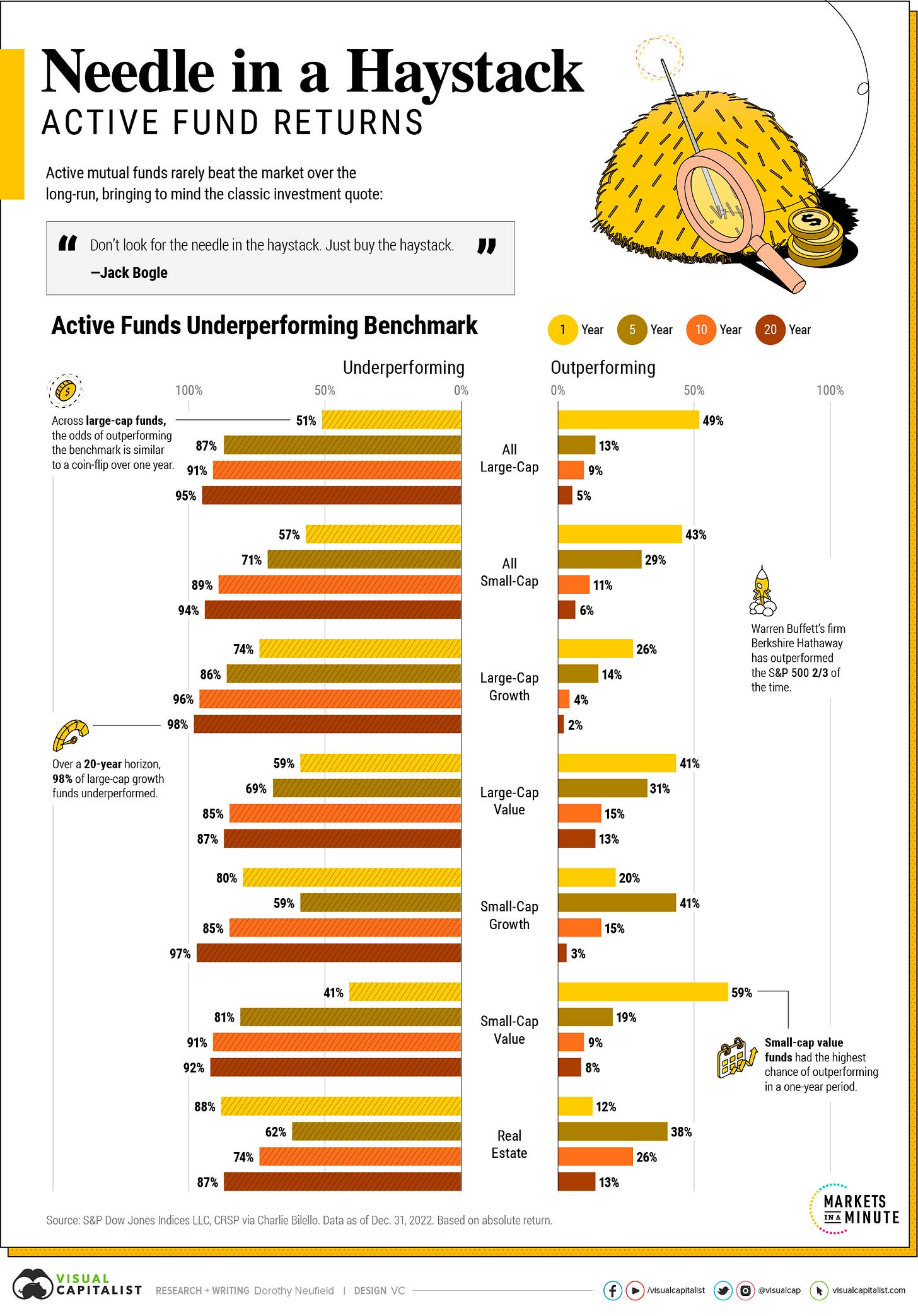 I numeri però sono implacabili. A quanto pare i fondi a gestione attiva battono molto raramente le controparti “passive”, ovvero i benchmark ovvero l’andamento “medio” del mercato, ovvero..